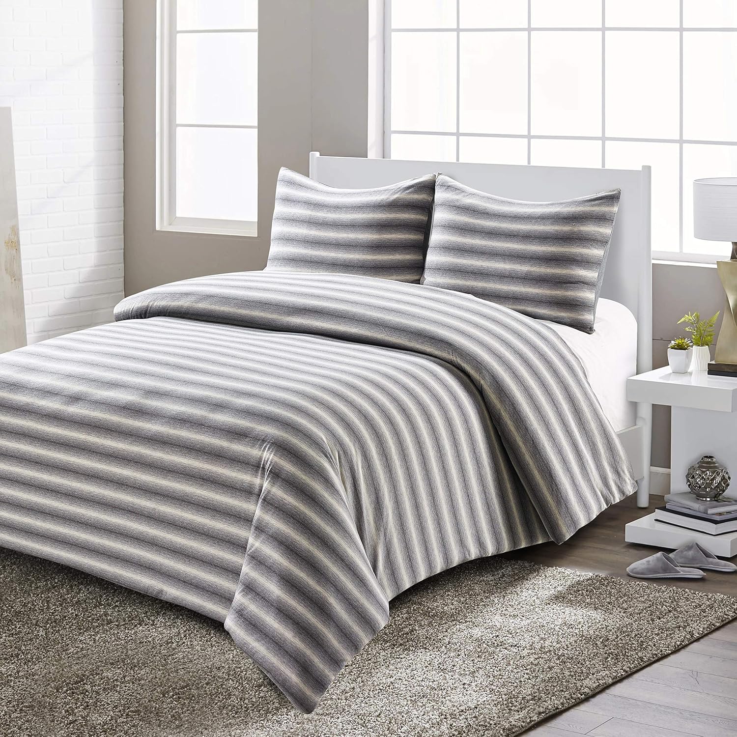 Amazon Com Style Quarters Super Soft Shadow Stripe Grey And White Jersey Comforter Set Reverses To A Solid Grey Color Machine Washable Includes 1 Comforter 2 Shams Queen Home Kitchen