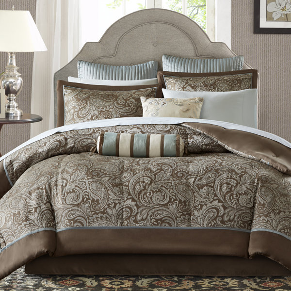 Amazon Com Madison Park Sateen Cotton Comforter Set Traditional Luxe Design All Season Lightweight Bedding Shams Bedskirt Decorative Pillows King 104 X92 Gabby Paisley Blue Beige 7 Piece Home Kitchen
