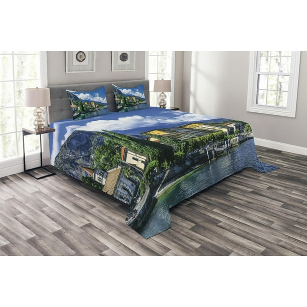 Italy Bedspread Set The Panoramic Landscape Of Lake Como Mountains And Clouds Digital Image Print Decorative Quilted Coverlet Set With Pillow Shams Included Blue And Green By Ambesonne Walmart Com Walmart Com