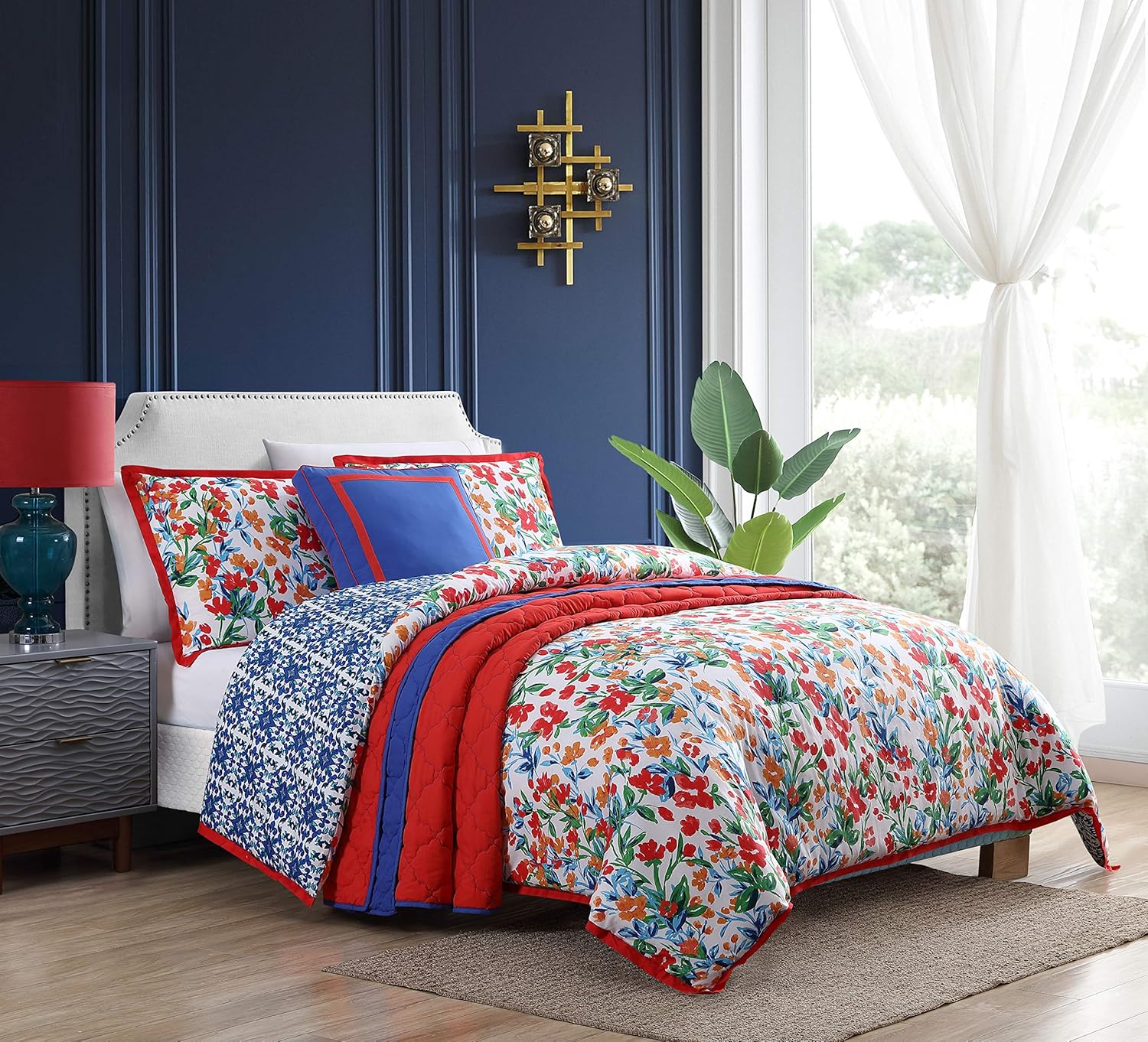 Amazon Com Vcny Home Cottage Cove Bedding Collection Day Lily Reversible Floral Comforter Set Twin Twin Xl Red Blue Home Kitchen