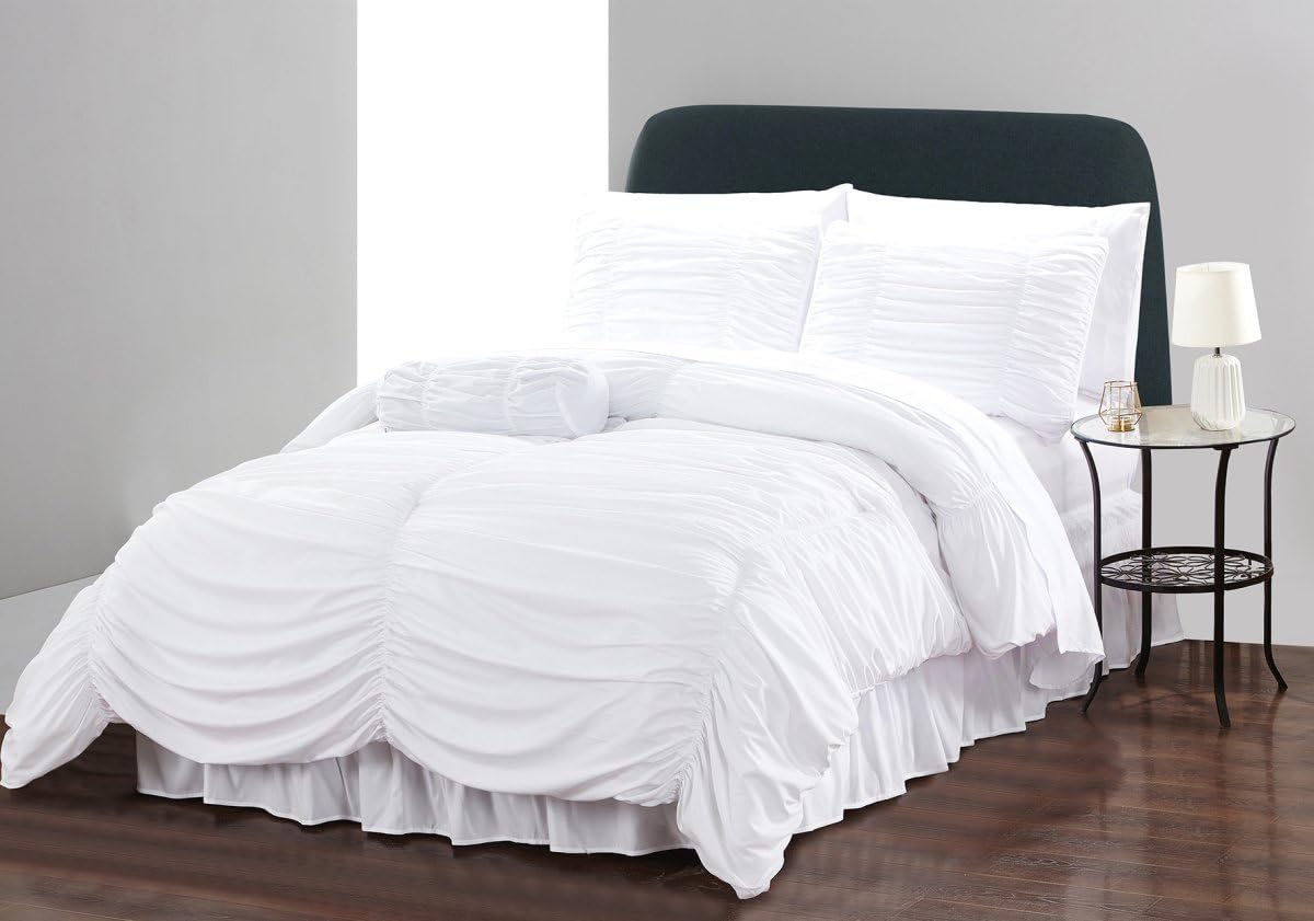 Amazon Com Lily David Romantic Ruched Pleat Comforter Set 8 Piece Premium Hypoallergenic All Season Comforter Pillow Sham 4 Sheets Sets And Dust Ruffle 16 Set King Cal King White