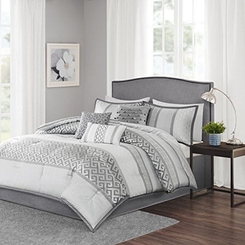 Amazon Com Madison Park Luxury Comforter Set Traditional Jacquard Design All Season Down Alternative Bedding Matching Bedskirt Decorative Pillows Queen 90 X90 Bennett Geometric Grey 7 Piece Home Kitchen