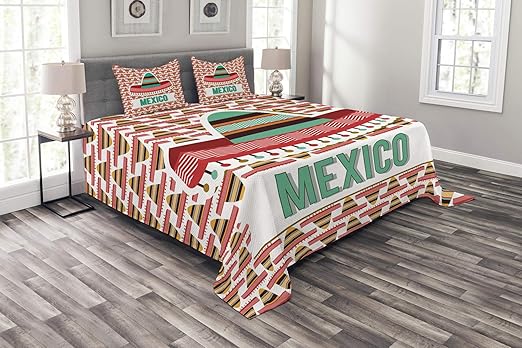 Amazon Com Lunarable Mexican Bedspread Mexico Design Cultural Hat Costume Traditional Elements Decorative Quilted 3 Piece Coverlet Set With 2 Pillow Shams Queen Size Pale Orange Mint Green Red Home Kitchen