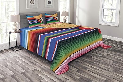 Amazon Com Lunarable Mexican Bedspread Mexican Culture Theme With Sombrero Straw Hat Maracas Serape Blanket Rug Picture Decorative Quilted 3 Piece Coverlet Set With 2 Pillow Shams Queen Size Multicolor Home Kitchen