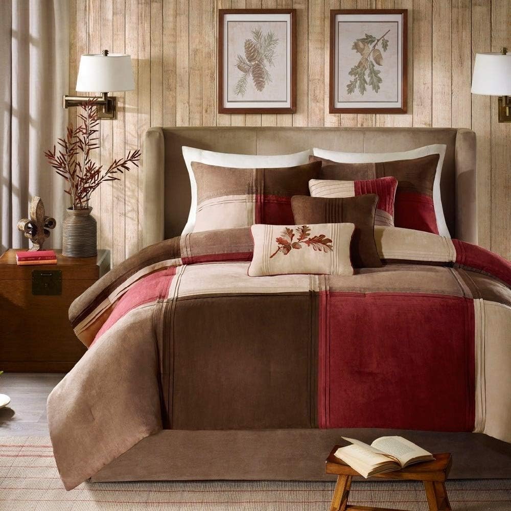 Amazon Com 7 Pieces Microsuede Comforter Set Cal King Color Block Pattern Red Brown Tan Beige Taupe Matte Look Soft Cozy Comfy Warm Brushed Fabric Casual Colorful Beautiful Decorative Kitchen Dining