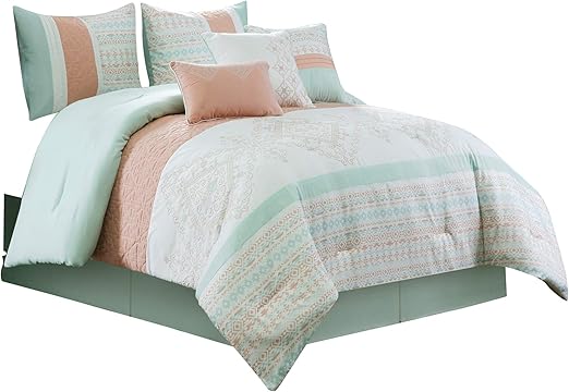 Amazon Com Chezmoi Collection Laura 7 Piece Coral Mint Geometric Embroidered Pleated Striped Comforter Set Queen Home Kitchen