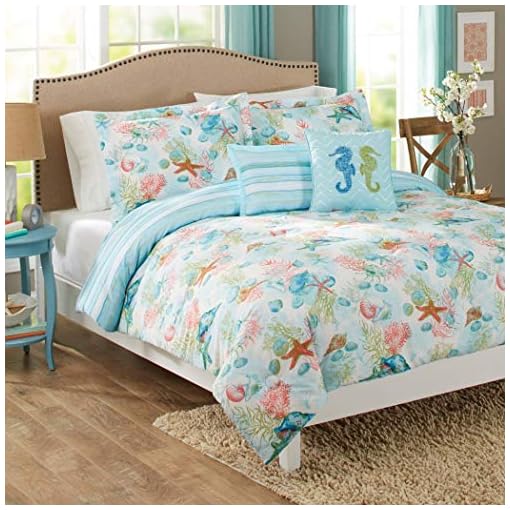 5 Piece Blue Multi Sealife Ocean Animals Themed Comforter Full Queen Set Featuring All Over Sea Shell Starfish Coral Beachfront Decor