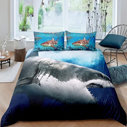 Amazon Com 3d Shark Fish Bedding Duvet Cover Twin Ocean Sea Themed Pattern Printed On Blue Comforter Cover 2 Piece Hawaiian Beach Theme Bedding Set Underwater Children Bedspread Cover For Kid Boy Girls Teen