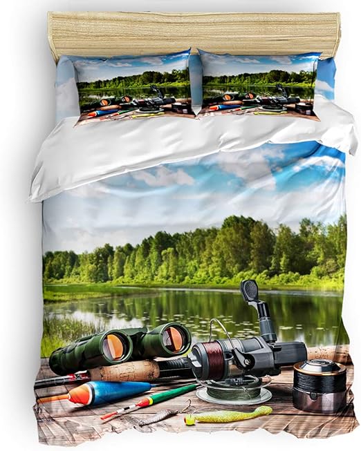 Amazon Com Queen Size 4 Pieces Bedding Set Outdoor Fishing Tool Soft Flannel Duvet Cover Set Comforter Cover Bedspread With Decorative 2 Pillow Shames Lake And Trees Home Kitchen
