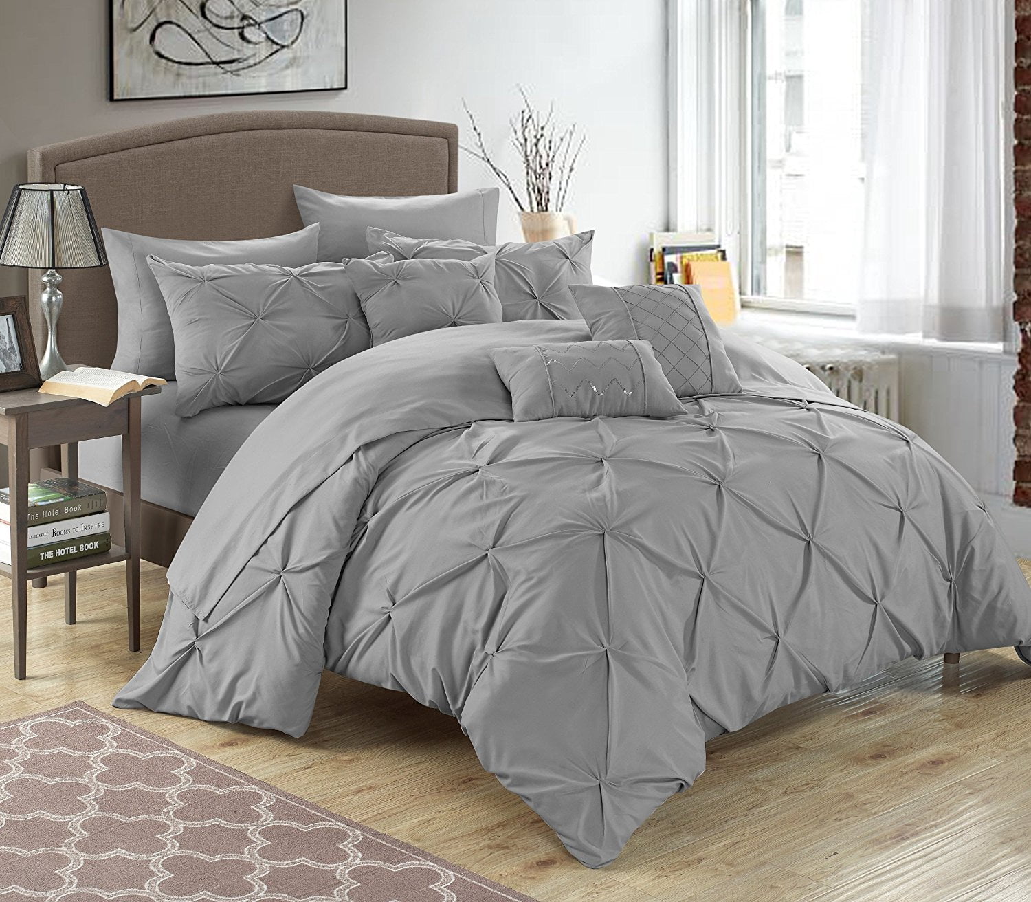 Amazon Com Divano Roma 7 Piece Modern Pinch Pleated Comforter Set Queen Grey Home Kitchen