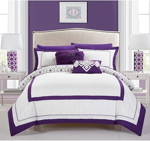 Amazon Com 7 Piece Twin Purple White Comforter Set Reversible Bedding Bedroom Set Color Block Patchwork Stripe Pattern Contemporary Style Machine Washable Microfiber Microplush Material Lightweight Home Kitchen