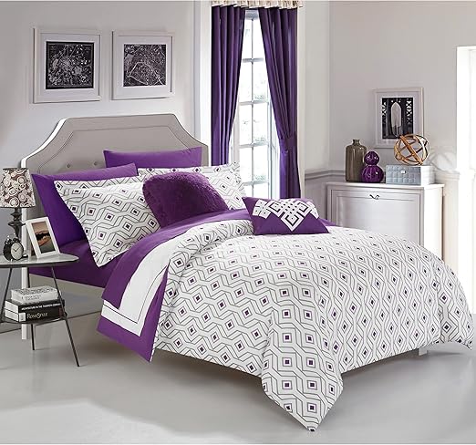 Amazon Com 7 Piece Purple White Color Block Patchwork Pattern Comforter With Sheets Twin Set Elegant Bold Piping Lines Design Diamond Motif Geometric Stripes Print Reversible Bedding Microfiber Microplush Home Kitchen