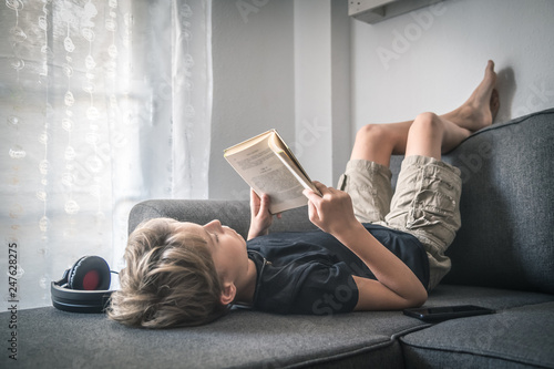 Blonde Boy Barefoot Reading Book Student Lying Down Learn The Lesson Comfortably Relaxed Diligent Child Reading