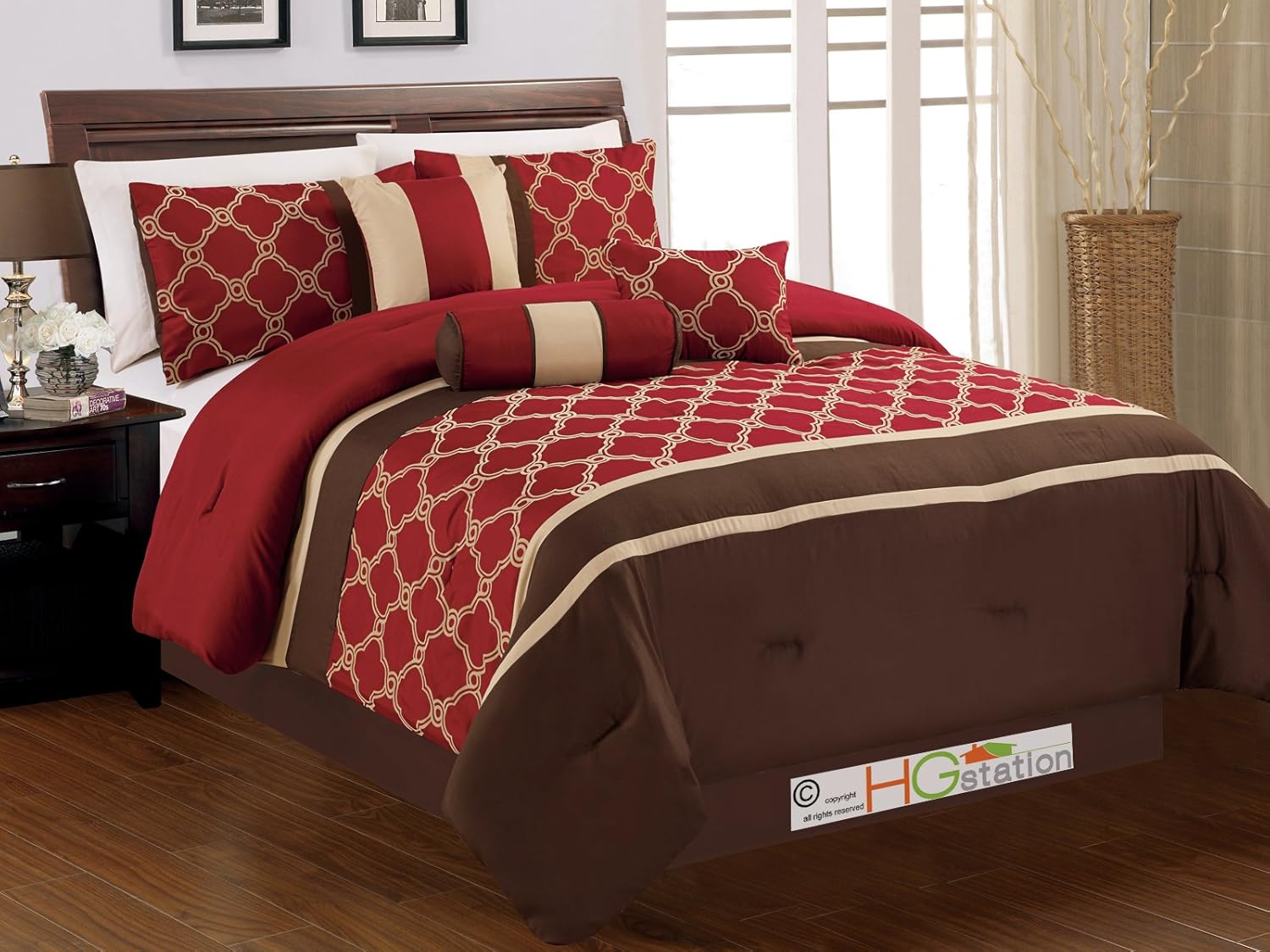 Amazon Com Hgs 7 Pc Embroidered Casablanca Trellis Moroccan Striped Comforter Set Burgundy Red Brown Tan Queen Home Kitchen