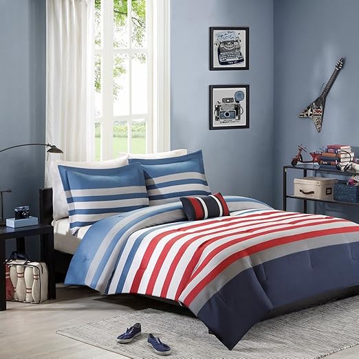 Amazon Com Boys Teen Red White Grey And Blue Stripes Comforter Set Full Home Kitchen