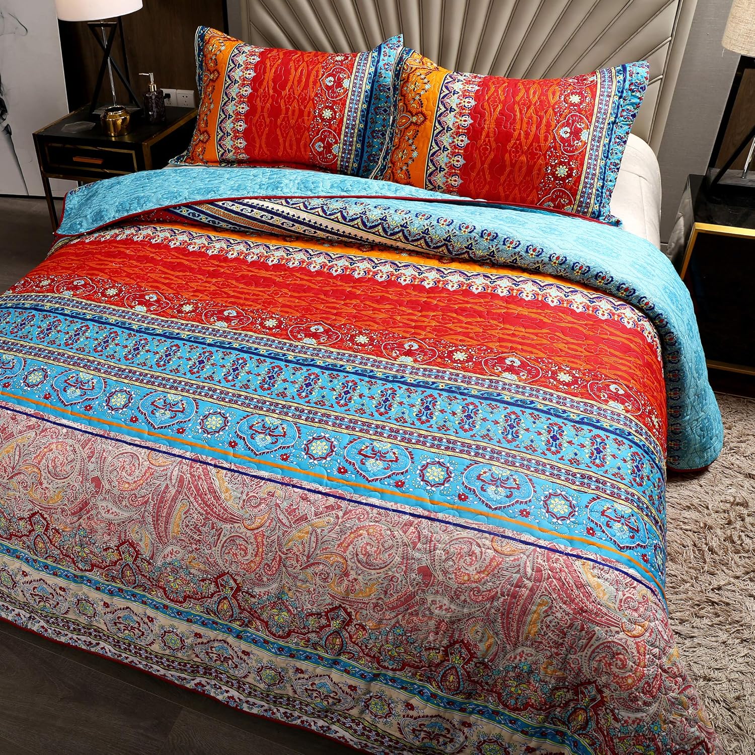 Amazon Com Lamejor Quilt Set Queen Size Boho Retro Style Floral Striped Patchwork Print Comforter Set 3 Piece Bedspread Coverlet Set Microfiber Home Kitchen