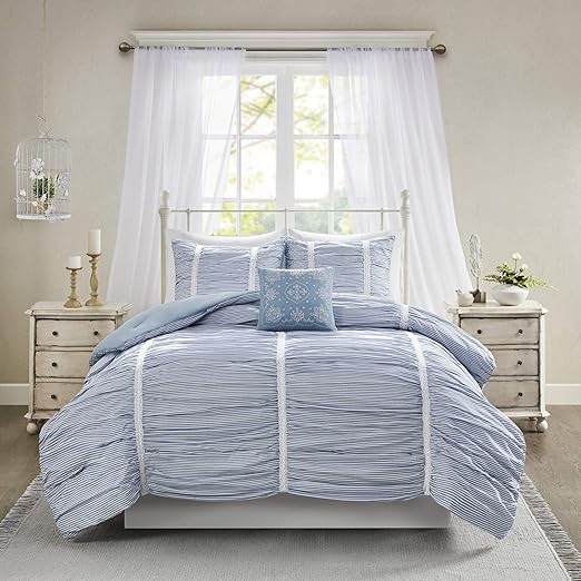 Amazon Com Madison Park Ana 4 Piece Comforter 100 Cotton Printed Stripe Ruched With Lace Accent Embroidered Pillow Shabby Chic Down Alternative Hypoallergenic All Season Bedding Set Full Queen Blue Home Kitchen