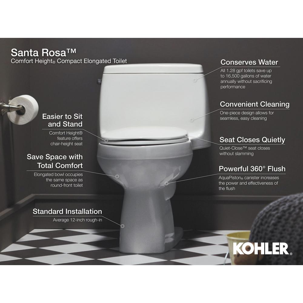 Kohler Santa Rosa Comfort Height 1 Piece 1 28 Gpf Compact Elongated Toilet With Aquapiston Flush Technology In White Toilet Kohler Wall Mounted Bathroom Sinks