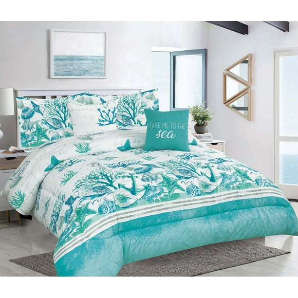 Full Queen Coastal Seashell Oversized 5 Piece Comforter Bedding Set With Shams And Throw Pillows Teal Walmart Com Walmart Com
