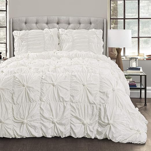 Amazon Com Lush Decor White Bella Comforter Set Shabby Chic Style Ruched 3 Piece Bedding With Pillow Shams Full Queen Home Kitchen
