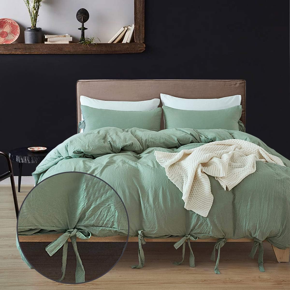 Amazon Com Mukka 3 Pieces Queen Size Bowknot Style Duvet Cover Washed Cotton Technical Sea Green Modern Simple Strap Design Home Kitchen