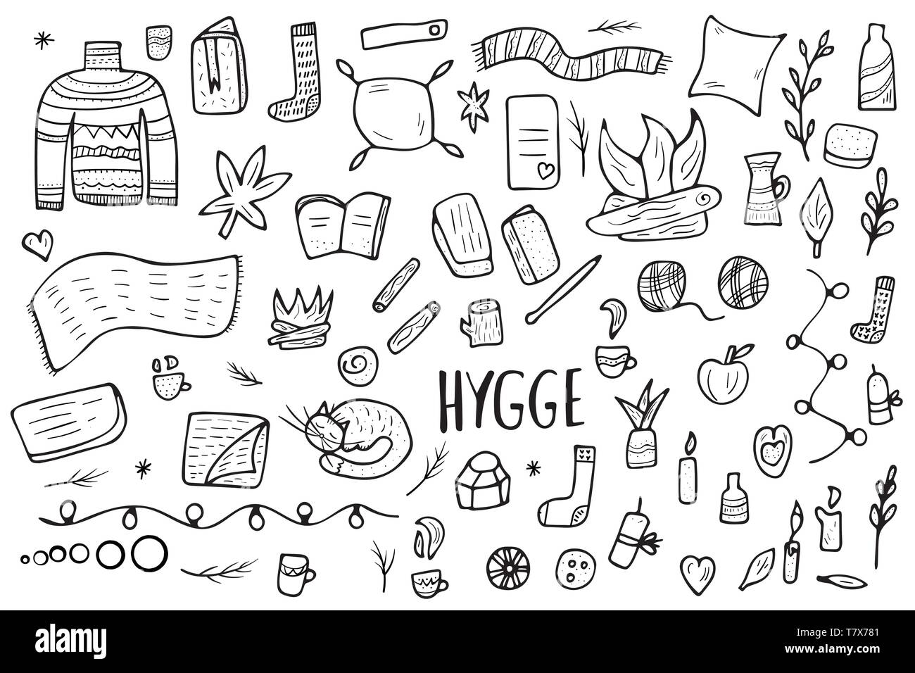Hygge Collection Of Sketch Things Vector Isolated Symbols Of Comfort In Doodle Style Danish Living Concept In Black And White Design Stock Vector Image Art Alamy