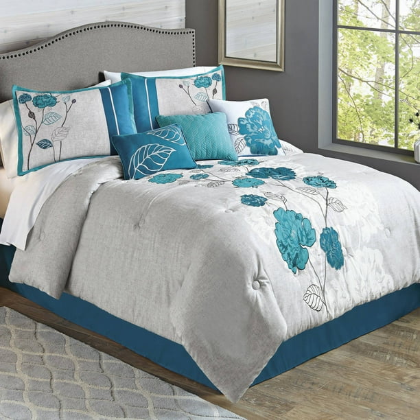 Mainstays Teal Roses 7 Piece Comforter Set Full Queen Walmart Com Walmart Com
