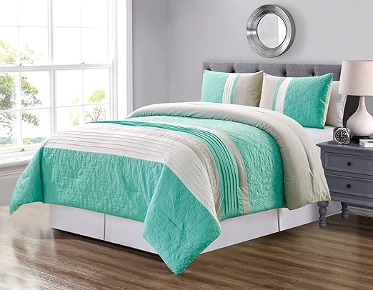 Amazon Com Wpm 7 Pieces Complete Bedding Ensemble Turquoise Blue White Beige Print Luxury Embroidery Comforter Set Bed In A Bag Elegant Bedding Quuen Home Kitchen