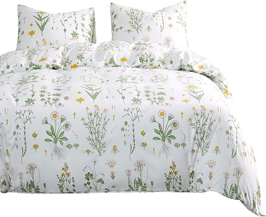 Amazon Com Wake In Cloud Botanical Comforter Set 100 Cotton Fabric With Soft Microfiber Fill Bedding Yellow Flowers And Green Leaves Floral Garden Pattern Printed On White 3pcs Queen Size Home